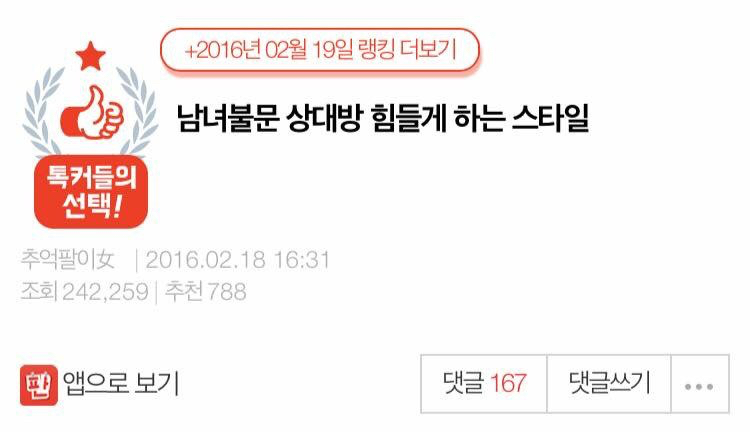 [스크랩] [기타]남녀불문 상대방 힘들게 하는 스타일.jpg 작성자준비된 선물|작성시간20.05.27|조회수10,167 목록 댓글 49 글자크기 작게가 글자크기 크게가 출처 : https://www.instiz.net/pt/5124400감정쓰레기통 취급; 다음검색 스크랩 원문 : *여성시대* 차분한 20대들의 알흠다운 공간 현재 게시글 추가 기능 열기 북마크 공유하기 신고 센터로 신고 댓글 댓글 49 댓글쓰기 답글쓰기 댓글 리스트 작성자ajehr | 작성시간 20.05.27 찡찡이 존나 싫어 답댓글 작성자ajehr | 작성시간 20.05.27 해결책 제시해줘도 소용없어 안듣고 찡찡... 작성자헬리오 트로피움 | 작성시간 20.05.27 존나 징징되네 ㅋㅋ 작성자밤에잠이안오는여시 | 작성시간 20.05.27 아 적당히좀 징징거려 ㅠ존나싫어 저런사람들은 본인 주변 돌아볼필요가 있음 친한사람 몇명 안남았을걸? 작성자무기력한 | 작성시간 20.05.28 존나 징징대서 개피건함 댓글 전체보기