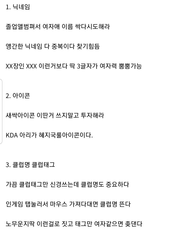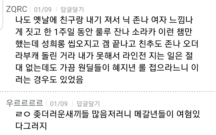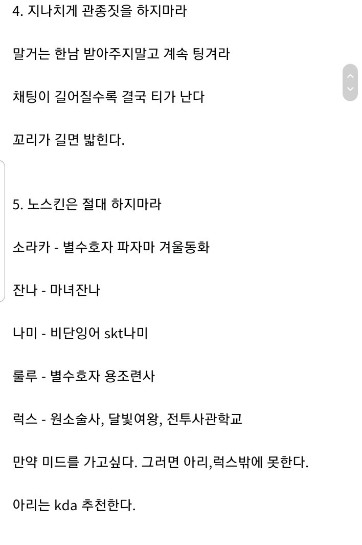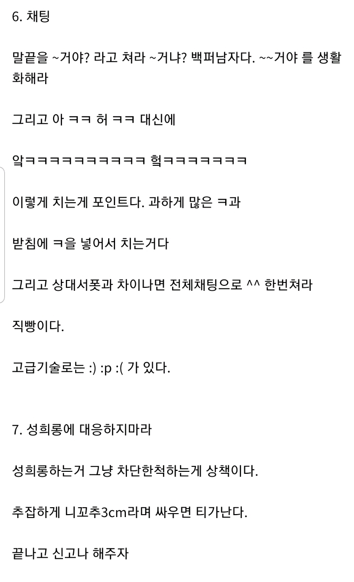 글 몇개봤는데 절대 원딜 앞으로 나가지 말라느니 중간중간 멍때리고 카톡/페메봤다고 해야 인싸 한녀같아서 남자들이 더 좋아한다 등등