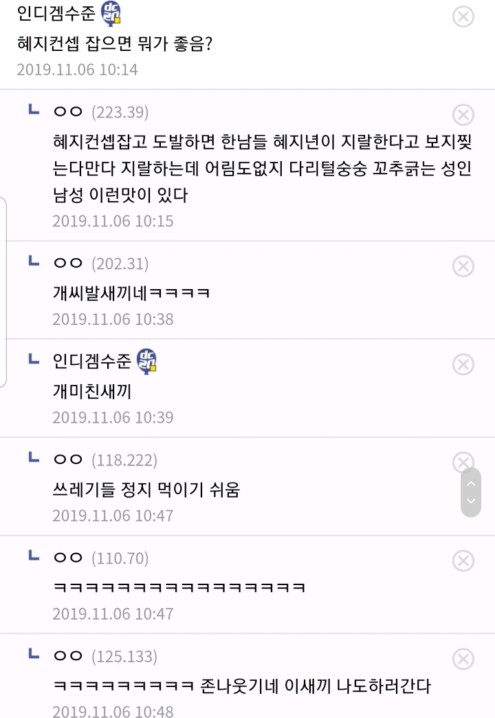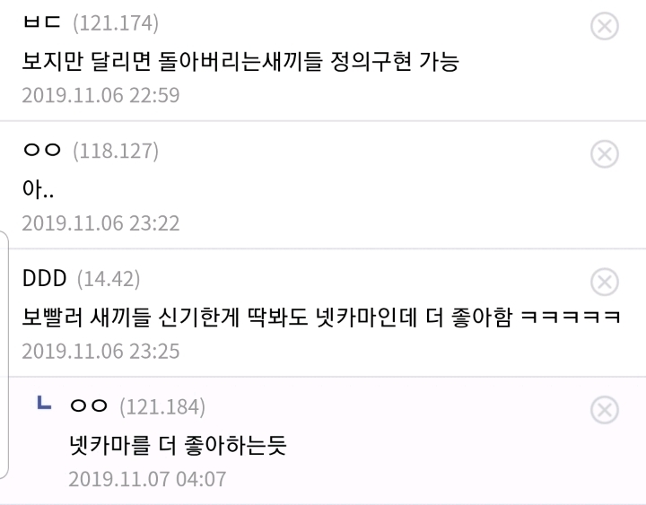 답댓글 작성자페미검열하지말자 작성시간 20.06.08 에휴 한남 넷카마들 아웃~!!! 규제댓 왜 이리 많노~~~