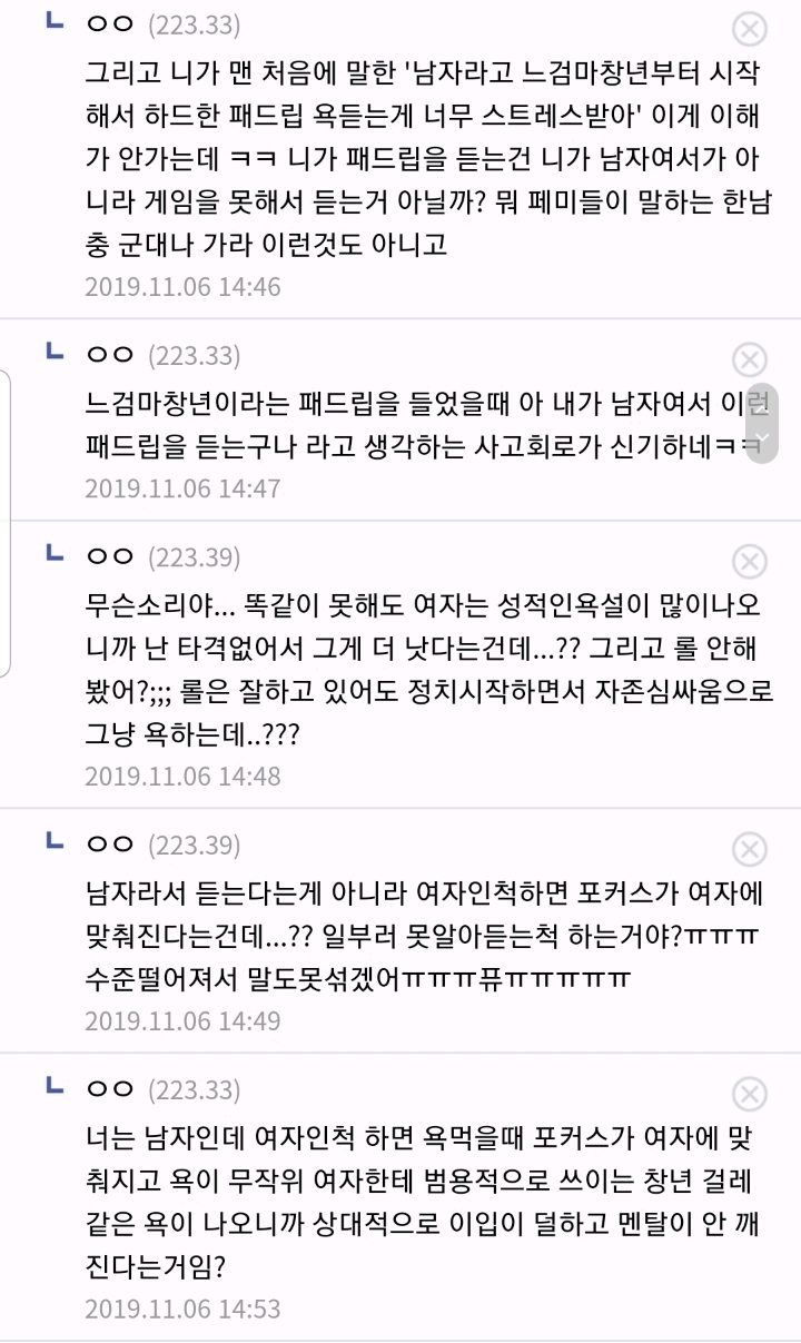 1 본인욕이나 패드립은 싫지만 섹드립등 여혐욕을 듣는건 아무렇지도 않아서 좋다
