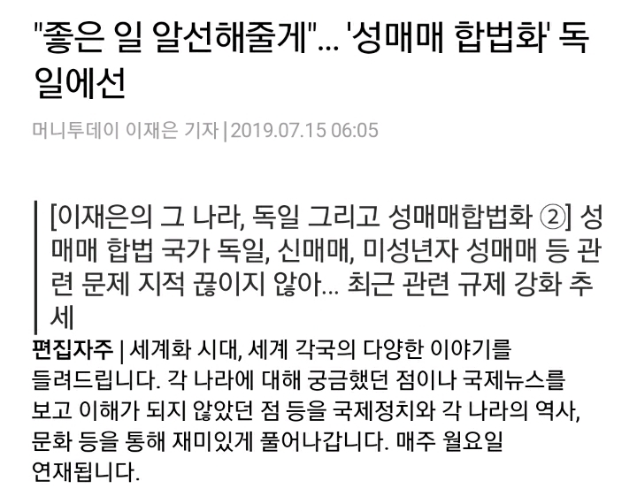 [여시뉴스데스크]"좋은 일 알선해줄게"… '성매매 합법화' 독일에선 작성자갓냥이는귀여워|작성시간20.06.10|조회수1,152 목록 댓글 2 글자크기 작게가 글자크기 크게가 출처 :https://m.mt.co.kr/renew/view_amp.html?no=2019070909263936949&no=2019070909263936949&fbclid=IwAR1bXhaXmUXYgXn217c4zZWxmfmqT9lpXLexuZz8CsR7qT_CxGgzEAl5o4Y&__twitter_impression=true성매매 = 여성에 대한 성착취 다음검색 현재 게시글 추가 기능 열기 북마크 공유하기 신고 센터로 신고 댓글 댓글 2 댓글쓰기 답글쓰기 댓글 리스트 작성자Imagine die | 작성시간 20.06.10 인신매매.. 강제 성매매.. ㅋㅋ 끔찍하다 진짜 작성자오ㅜㅑ | 작성시간 20.06.10 성매매합법화자체가 특정성별만 벼랑끝까지 몰고가는거지 왜 특정성별이냐면 한남자지는 굳이 돈주고 안삼 댓글 전체보기
