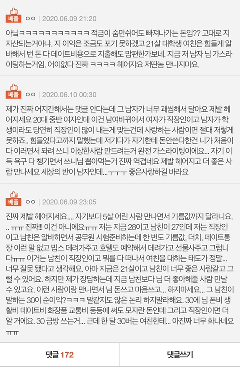 작년 상황 (저20/남친25) : 크게 생각나는 것들만 적을게요( 차 기름 값 더치 해달라해서 해준 적 한 두번 있고 모텔비도 더치 한 적 한 번 있고 생일선물로 에어팟 갖고 싶다해서 해줬고 데이트 비용은 거의 6:4 였어요/ 이게 데이트 할 땐 오빠가 “나 밥 샀으니 너 영화 사” 이렇게 직접 말로 해서 딱 더치는 아니었지만 거의 반반 했어요/ 그리고 내년 여름휴가 때 호캉스 누리자고 각자 70만원씩 모으자고 해서 매달 각자 7만원씩 모으고 있었어요)