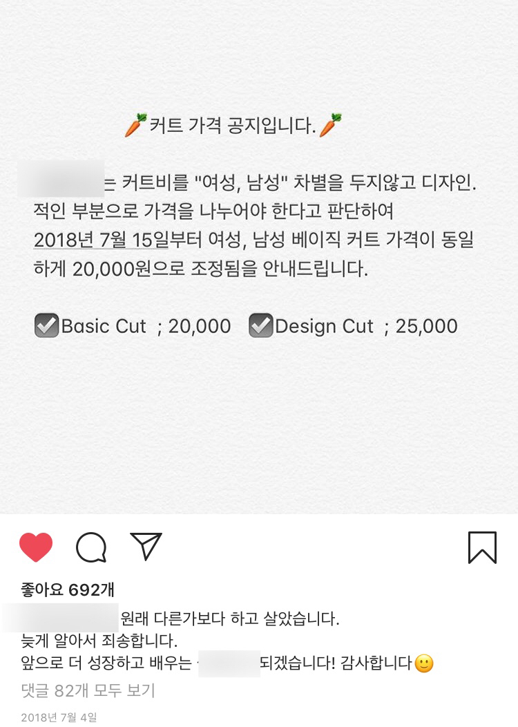 대부분의 미용실들이 여성과 남성 커트 가격이 기본 이천원부터 많으면 오천원까지 차이가 나더라고