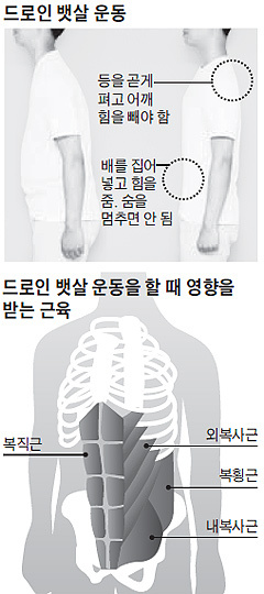 드로인 뱃살 운동의 효과를 제대로 보려면 자세를 바로 해야 한다. 등을 곧게 펴고 어깨 힘을 빼고, 숨을 멈추지 말아야 한다. 등이 굽어 있으면 배에 힘이 제대로 들어가지 않고, 어깨는 힘이 들어가면 쉽게 뭉치기 때문이다. 호흡을 제대로 안 하면 근육이 자리를 잘 못 잡고, 지방 연소 효과도 떨어진다.