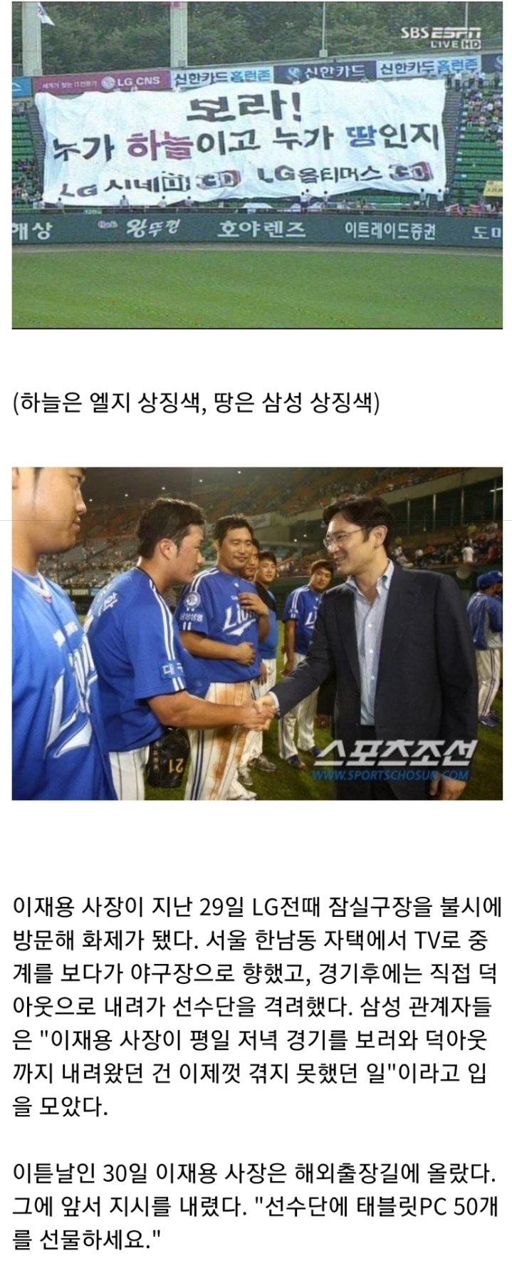 작성자내가더잘할게는개뿔나만한사람없다 작성시간 20.06.14 삼성과 엘지가 전자제품 재계라이벌이라 야구팀도 몇년전까지만 해도 서로 트레이드도 안했었음. 옛날에 부정배트 시비사건이 있기도했고. 잠실에서 삼성 엘지 경기하는데 엘지가 이기고 있는 상황에서 엘지쪽에서 대놓고 삼성 저격하는 현수막 걸었고, 그걸 집관하던 이재용이 보고 잠실구장으로 달려갔는데 그 사이에 삼성선수단이 이 악물고 역전해서 이김. 이재용의 승리의 요정 타이틀 지켜줌. 그래서 이재용이 흡족해서 선수단에게 금일봉 하사함. 끝.