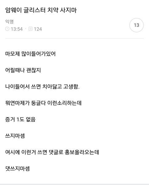 -암웨이 글리스터 치약 비추천글을 쓰면 댓글로 증거를 가져오라는 사람이 꾸준히 있다.