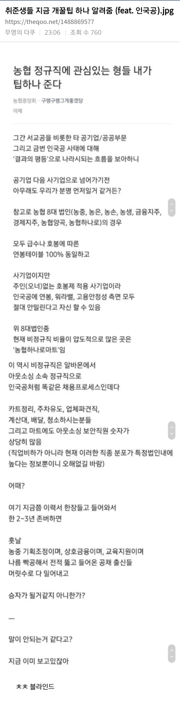 솔직히 스펙이나 학벌 특별히 안좋은데 입행 생각하는거면 그냥 집에쳐박혀서 문제집푸는거보다 일단 계약직이라도 하면서 기회노리는게 오조오억배 가능성 높다고 생각함