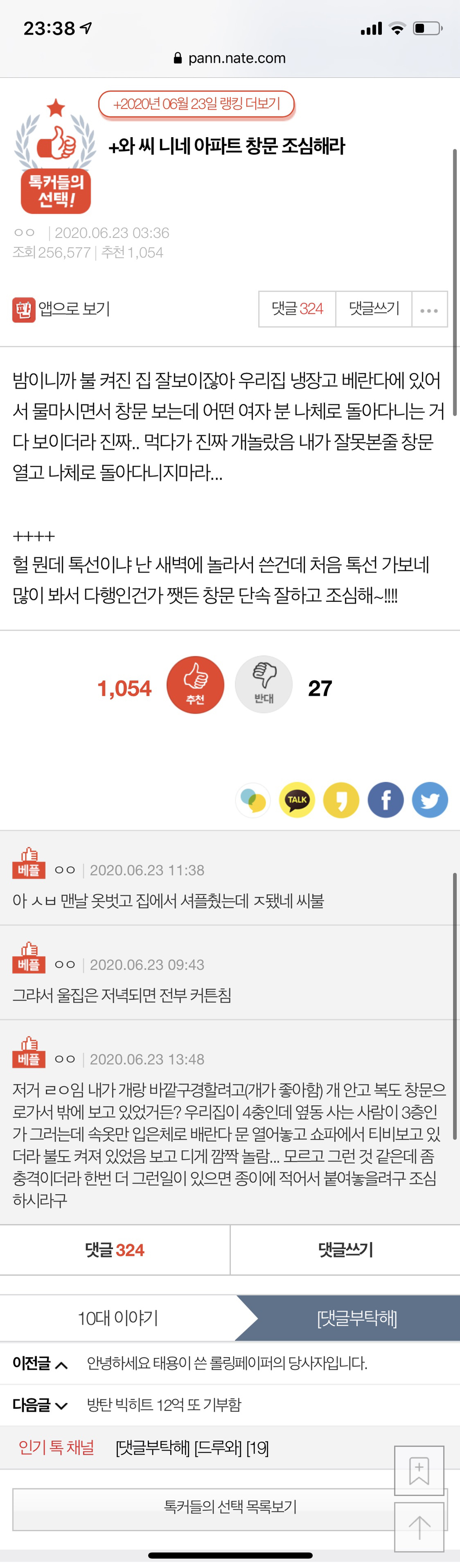 작성자자홍 작성시간 20.06.25 아 나도 대낮이긴 했는데 샤워하고 알몸으로 나왔는데 창문 열려있어서 바로 앞 아파트에 어떤 아저씨랑 눈마주친거 같아가지고 진짜 좆같았는데..