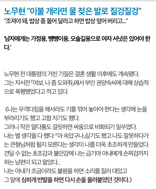 [스크랩] [씹빨쌔끼뜰]노무현 "남자에게는 가정용, 뺑뺑이용, 오솔길용으로 여자 서넛은 있어야 한다." 작성자청와대도 공범이다|작성시간20.07.20|조회수5,384 목록 댓글 57 글자크기 작게가 글자크기 크게가 출처 : 여성시대 94858전 노무현 대통령 올려치는 분위기 있길래 가져와봄... 그래도 한남은 한남이다 다음검색 스크랩 원문 : *여성시대* 차분한 20대들의 알흠다운 공간 현재 게시글 추가 기능 열기 북마크 공유하기 신고 센터로 신고 댓글 댓글 57 댓글쓰기 답글쓰기 댓글 리스트 작성자은준 | 작성시간 20.07.20 이거 계속 흐린눈 하더라ㅋㅋ대단하다 작성자ising | 작성시간 20.07.20 진보씹치+경상도남=최악 작성자취뽀할거야 | 작성시간 20.07.20 하하^^.. 작성자와따리가따리 | 작성시간 20.07.20 이거 알아서 절대 존경이 안되더라ㅋㅋㅋㅋ김대중은 존경해도 놈 현 문재인은 존경안돼 작성자스타필드 | 작성시간 20.07.21 와 진짜 너무하셨네.....실망이다..부인을 때리는게 절대로 정상이 아닌데... 댓글 전체보기