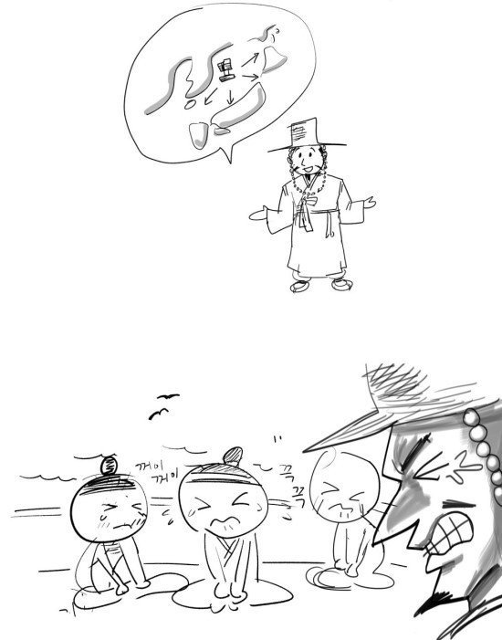 ▷ 물고기를 잡던 원주민은 이 선달의 명주옷이 무척 마음에 들었던 모양이다.