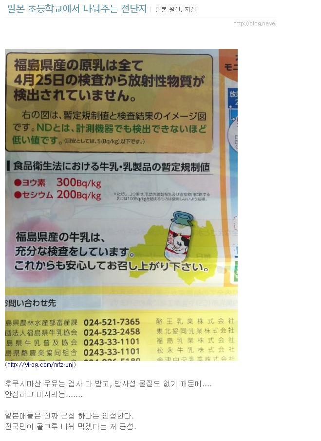 후쿠시마산우유 안심하고 마시라는 전단지