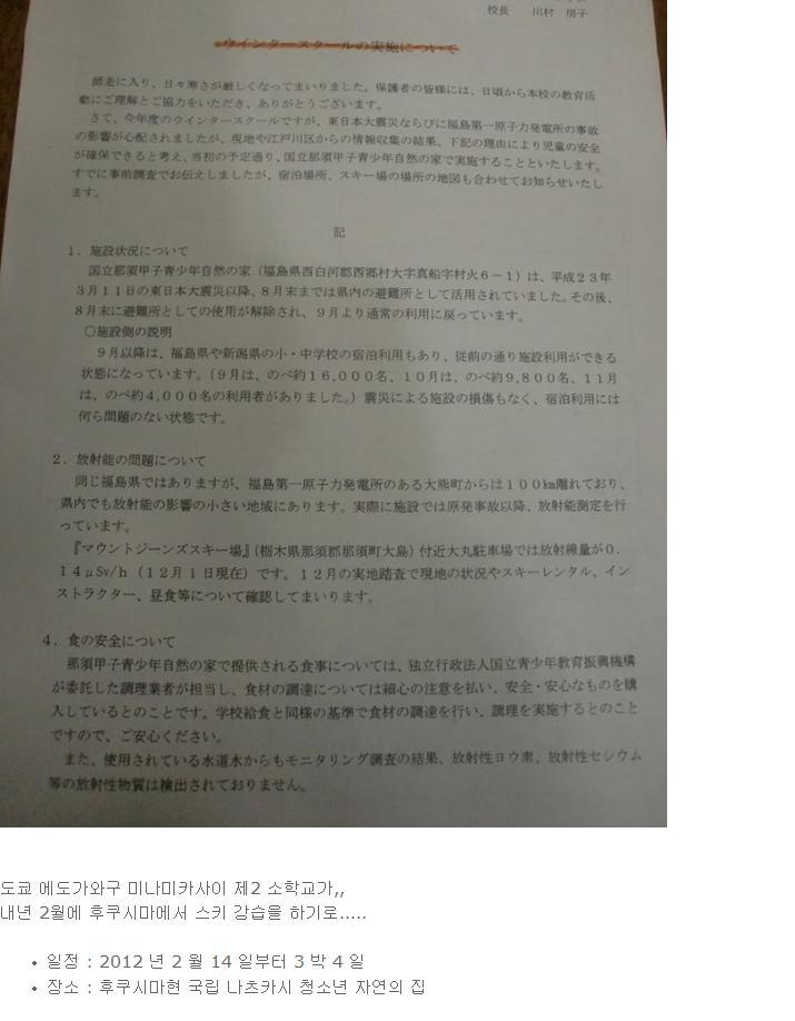 도쿄초등학교에서 방사능위험지역인 후쿠시마로 스키강습 ㄱㄱ;;;