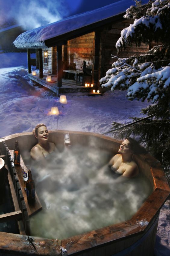 한겨울 눈을 즐기면서 목욕할수 있는 나무 욕조