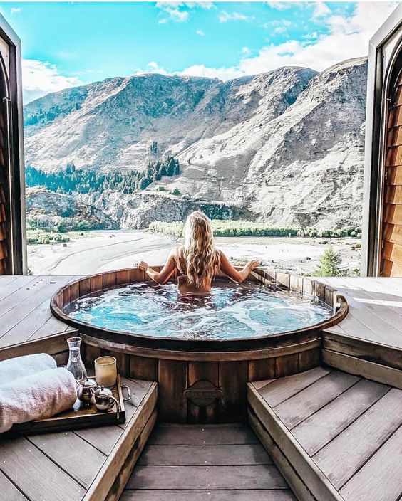 산을 보면서 목욕할수있는 나무욕조