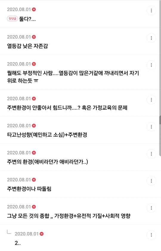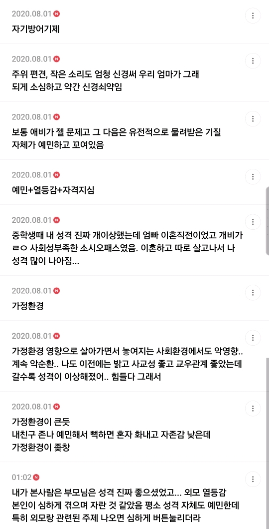 작성자사극처돌이 작성시간 20.08.02 환경 중요... 우리 부모님 둘다 진짜 불만엄청많고 이것도불만 저것도불만 약간 이런타입인데 나는이게 진짜 싫다고 생각했거든? 근데 밖에 나가 보니까 나도 부모님이랑 똑같이 하고있다는걸 어느순간 느끼게됌 그래서 십몇년동안 진짜 성격 고치려고 노력했고 지금은 성격 다뜯어고쳐서 친구도 많아지더라