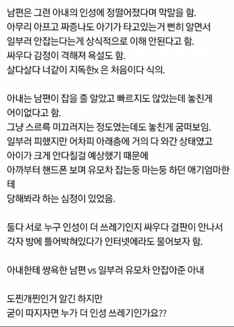 싸움은 여기서부터임.남편은 굴러가는 유모차를 잡아보려 했지만 놓침.아내는 유모차에 부딪히고 나서 잡아줄수도 있긴 했지만부딪힌게 너무 짜증나고 아파서 일부러 안잡음.