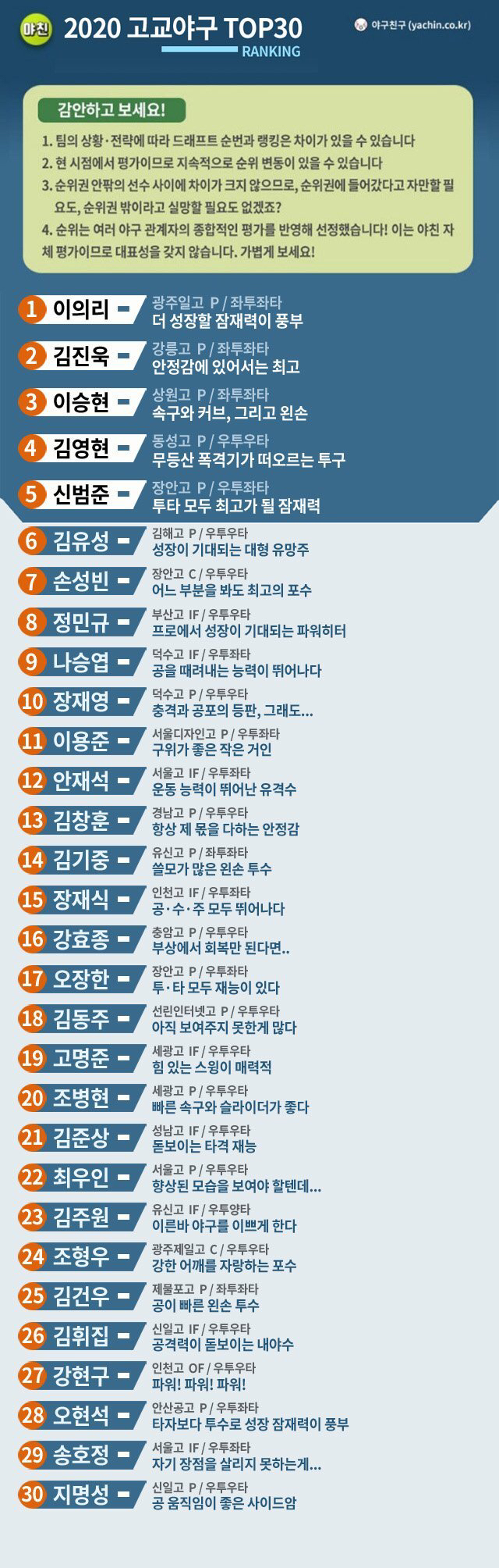 [흥미돋][아마야구] 야구친구 2020 고교야구 Top 30 작성자아리까리까나|작성시간20.08.12|조회수2,592 목록 댓글 35 글자크기 작게가 글자크기 크게가 출처 : https://www.instagram.com/p/CDxttV9nXxK/?igshid=12hnszigqs7s9청룡기 성적 반영 1. 이의리 : 기아 1차 지명 유력 2. 김진욱: 롯데 1라 지명 유력3. 이승현: 삼성 1차 지명 유력 6. 김유성: 엔씨 1차 지명 유력 10. 장재영: 키움 1차 지명 유력(다른 팀도 1차 후보 있다면 알려주세요..) 다음검색 현재 게시글 추가 기능 열기 북마크 공유하기 신고 센터로 신고 댓글 댓글 35 댓글쓰기 답글쓰기 댓글 리스트 작성자앱업데이트?새아빠를 들일셈이냐? | 작성시간 20.08.12 재식아 잘해봐라 작성자내일은 꼭 짬뽕을 먹겠어 | 작성시간 20.08.12 엔씨팜이 top30도 모자라 top10안에 든다니 눈물이 다 나네... 유성아 어솨 니 자리 많다 작성자꽃과같다 | 작성시간 20.08.12 재영아 무슨일이야 작성자똥깡아지 | 작성시간 20.08.12 갸으리🐯 작성자NO.13 안치홍 | 작성시간 20.08.12 꼴진욱 꼴승엽 빨리 와!!!!! 댓글 전체보기