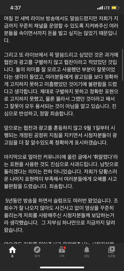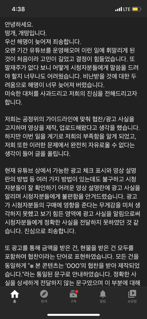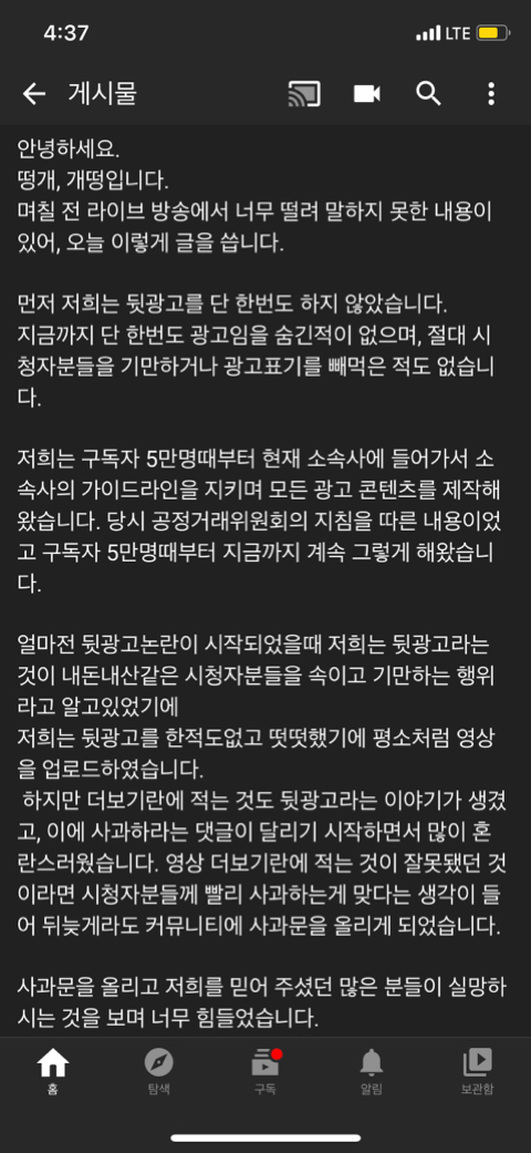 요약 ) 더보기란에 표시한 것도 뒷광고라는 말에 사과함 지금 논란중인 뒷광고는 내돈내산인척 하고 시청자들 기만한거기때문에 다른 유투버들과는 좀 다른듯