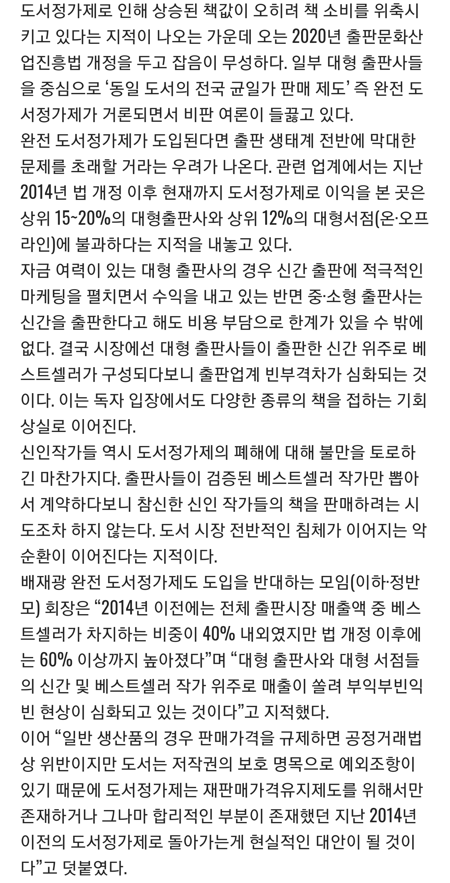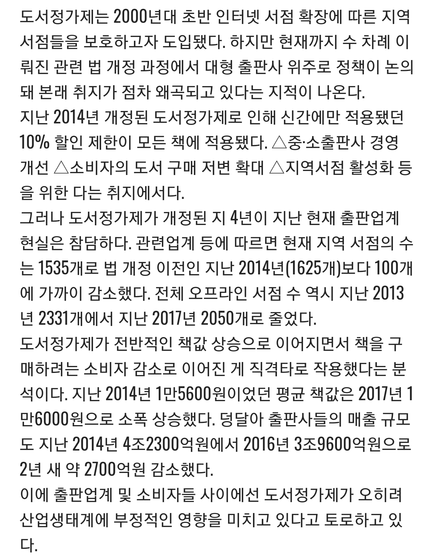 [스크랩] [여시뉴스데스크]빛바랜 도서정가제, 출판생태계 파괴 악순환 주범 작성자데본아오키|작성시간20.08.16|조회수4,905 목록 댓글 19 글자크기 작게가 글자크기 크게가 출처 : http://m.skyedaily.com/news_view.html?ID=92690 [장수홍 기자 / 스카이데일리] 다음검색 스크랩 원문 : 비공개카페 현재 게시글 추가 기능 열기 북마크 공유하기 신고 센터로 신고 댓글 댓글 19 댓글쓰기 답글쓰기 댓글 리스트 작성자코캌콜라 | 작성시간 20.08.16 책 너무 비싸 몇권 담고나면 5-6만원이야 작성자민티바 | 작성시간 20.08.16 우민화 정책인거면 성공이여 작성자피자쳐돌 | 작성시간 20.08.16 매달 5~10만원씩은 샀었는데 .., 작성자강영수 부장판사 | 작성시간 20.08.16 폐지하라! 작성자말-머-리! | 작성시간 20.08.16 서점에서 책 보다가 한두권 사고 선물도 하고 그랬었는데 이제 전자책도서관에서 빌려읽음 비싸 댓글 전체보기
