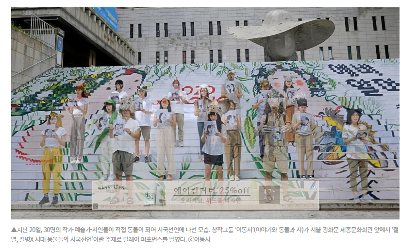 ‘인간을 위한 공장’에 갇혀있는 동물의 눈으로 바라봐야 팬데믹의 본질이 보인다. 지난 20일, 30명의 작가·예술가·시인들이 직접 동물이 되어 시국선언에 나섰다. 창작그룹 ‘이동시’(이야기와 동물과 시)가 서울 광화문 세종문화회관 앞에서 ‘절멸, 질병X 시대 동물들의 시국선언’이란 주제로 릴레이 퍼포먼스를 벌였다.