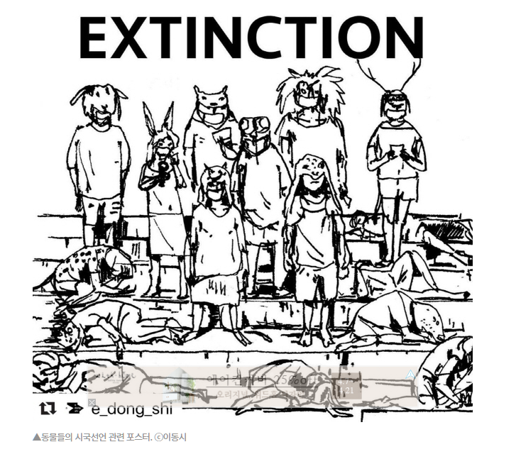 “인간들, 코로나 때문에 한 명만 죽어도 호들갑을 떨면서, 우린 수천만 마리 땅에 묻고 손을 탁탁 털더라!”(동물들의 절멸 선언문 중)