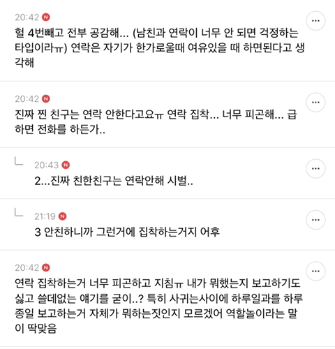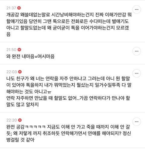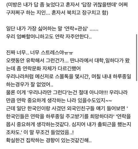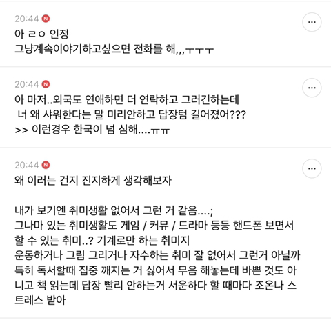 작성자빵또하 작성시간 20.09.03 나 예전에는 연락에 일희일비했는데 왜그랬나 싶어,, 아진짜 너무귀찮고 이따위 의미없는소리가 뭔소용인가싶어,, 진짜 ,, 만나서 얘기하면안될까? 너무귀찮아