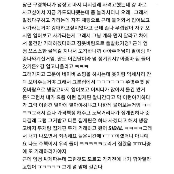 [스크랩] [기타]새벽 1시에 당근마켓 직거래한 후기.jpg 작성자딱재|작성시간20.09.13|조회수25,541 목록 댓글 52 글자크기 작게가 글자크기 크게가 . 다음검색 스크랩 원문 : 도탁스 (DOTAX) 현재 게시글 추가 기능 열기 북마크 공유하기 신고 센터로 신고 댓글 댓글 52 댓글쓰기 답글쓰기 댓글 리스트 작성자떼롱 | 작성시간 20.09.13 ㅋㅋㅋㅋ아 이런거 너무행복햌ㅋㅋㅋㅋㅋㅋ 작성자발성연습 | 작성시간 20.09.13 이세상에 여자들만 살았으면 좋겠다 작성자미소녀전사 | 작성시간 20.09.13 네이버쇼핑몰 이름 알고싶다ㅎㅎ 작성자Rilririya | 작성시간 20.09.13 ㅠㅠㅠㅠ 힐링 작성자사천짜파게티 | 작성시간 20.09.13 나도 어르신들이랑 거래하면서 아침 6시에 거래한 적있엌ㅌㅋㅋㅋ 댓글 전체보기