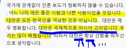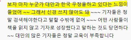 1. 대만도 '기레기'랑 비슷한 단어가 있나봐 그래서 그런 말을 쓰면서 (어렸을때 공부 안하면 기자가 된다 뭐 이런 문장인듯) 이렇게 대놓고 혐한 부추기는 언론 안믿다함