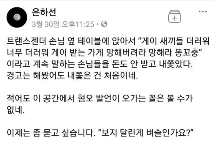작성자내 욕망엔 계기가 없어 작성시간 20.09.23 ㅋㅋㅋㅋㅋ 개웃기네 보지달린 게 벼슬이면 니가 내쫓을 수나 있었겠니....? 저런 욕 대놓고 했다는 것도 당연히 주작이었겠지만 마동석이 그 자리에서 그런 욕 하면 독같이 내쫓았을까...? ㅋㅋㅋㅋㅋㅋ