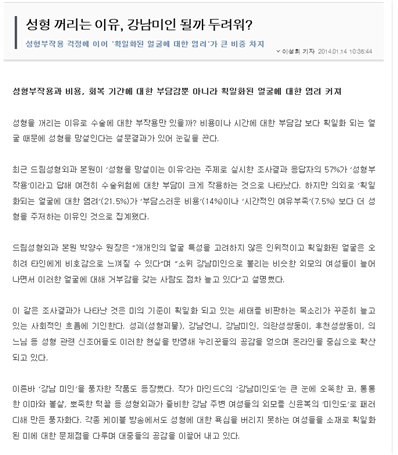 강남미인이라고 묘사되는 성형을 겁내고 ‘강남 미인’이라는 용어가