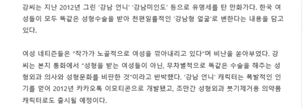 또한 강남미인화에 대한 피드백은 성형문화와 의사에 관한 거라고 주장하며 그 만화로 인한 결과에 대한 것에는 언급이 없어