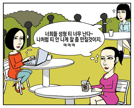 성형한 여성들은 자연 미인을 질투하는 것처럼 상대적으로 열등하게 표현함.