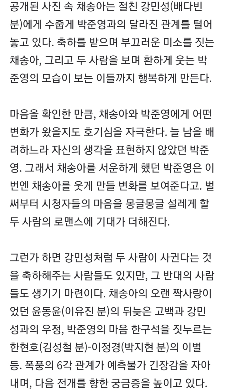 [스크랩] [흥미돋]‘브람스’ 박은빈(하트)김민재 ㅇㅇ 그 이후, 음대 공식 CC 된다 작성자미도와파라솔~|작성시간20.09.27|조회수9,157 목록 댓글 22 글자크기 작게가 글자크기 크게가 🚫 지난 방송 스포 있음 🚫 ‘브람스’ 박은빈♥김민재 키스 그 이후, 음대 공식 CC 된다[뉴스엔 이민지 기자] 박은빈과 김민재가 음대 공식 CC(캠퍼스 커플)가 된다. SBS 월화드라마 '브람스를 좋아하세요?'(극본 류보리/연출 조영민)가 채송아(박은빈 분)와 박준영(김민재 분)이 첫키스n.news.naver.com 지금까지 커플이 아니였다는게 놀랍다... ^_______^ 누가 나 오함마로 기절시켰다 월요일에 깨워줘.. 다음검색 스크랩 원문 : 쭉빵카페 현재 게시글 추가 기능 열기 북마크 공유하기 신고 센터로 신고 댓글 댓글 22 댓글쓰기 답글쓰기 댓글 리스트 작성자떡볶이 맨날 먹고싶어 | 작성시간 20.09.27 드디어 내일이다 ㅎㅎㅎ 작성자BAAAAM | 작성시간 20.09.27 작성자허브티2 | 작성시간 20.09.27 씌앙....월요병 치료 완. 작성자좋좋좋아 | 작성시간 20.09.27 김민재 키 엄청작지 않아? 남주는 못하겠다싶었는데 그정돈 아니었나보다 정주행 해보까ㅋㅋ 작성자oooooo | 작성시간 20.09.28 하 씌앙..... 그저 최고 ㅠ 댓글 전체보기