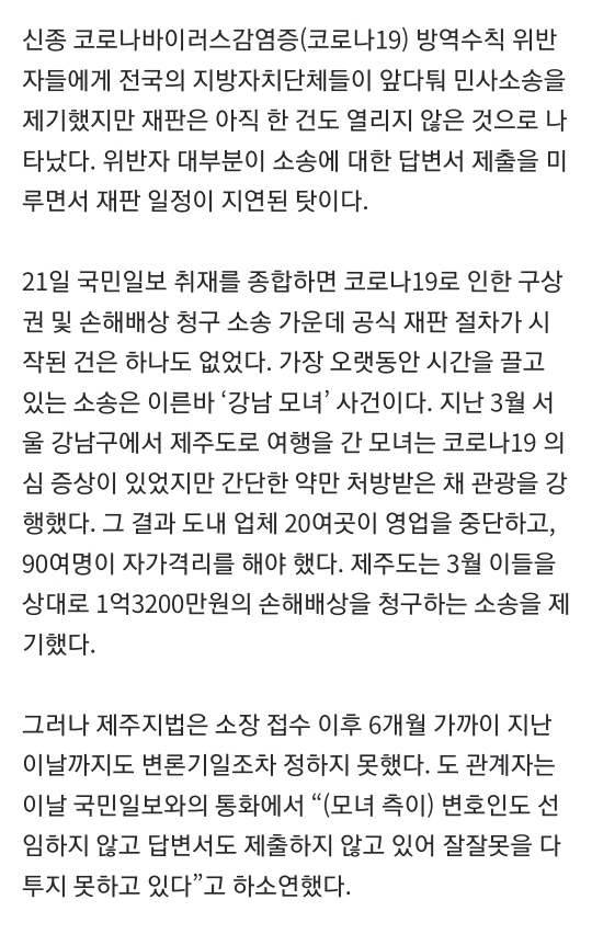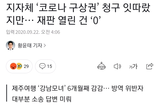 [여시뉴스데스크]지자체 ‘코로나 구상권’ 청구 잇따랐지만… 재판 열린 건 ‘0’ 작성자스무스하게|작성시간20.09.29|조회수1,056 목록 댓글 2 글자크기 작게가 글자크기 크게가 출처 :https://n.news.naver.com/article/005/0001364325 다음검색 현재 게시글 추가 기능 열기 북마크 공유하기 신고 센터로 신고 댓글 댓글 2 댓글쓰기 답글쓰기 댓글 리스트 작성자Soya | 작성시간 20.09.29 엥 걍 미루면 미뤄지는거? 뭐여 작성자칫톳스 | 작성시간 20.09.29 6개월 에반데? 안받으면 공시송달하고 답변서없으면 원고 청구 인용해야하는거아녀? 댓글 전체보기