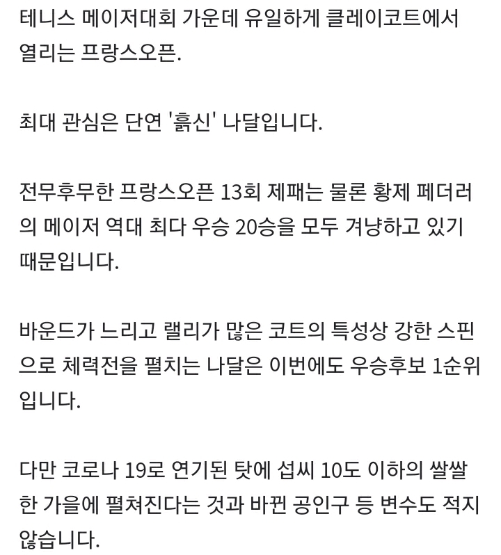 [여시뉴스데스크]'흙신' 나달, 13번째 우승 도전...코로나 등 여전히 변수 작성자레골라스|작성시간20.09.29|조회수869 목록 댓글 1 글자크기 작게가 글자크기 크게가 출처 : https://n.news.naver.com/sports/general/article/052/0001496187 다음검색 현재 게시글 추가 기능 열기 북마크 공유하기 신고 센터로 신고 댓글 댓글 1 댓글쓰기 답글쓰기 댓글 리스트 작성자U드래곤 | 작성시간 20.09.29 팀 우승한게 엊그제 같은데;; 벌써 프랑스 오픈이라니 댓글 전체보기
