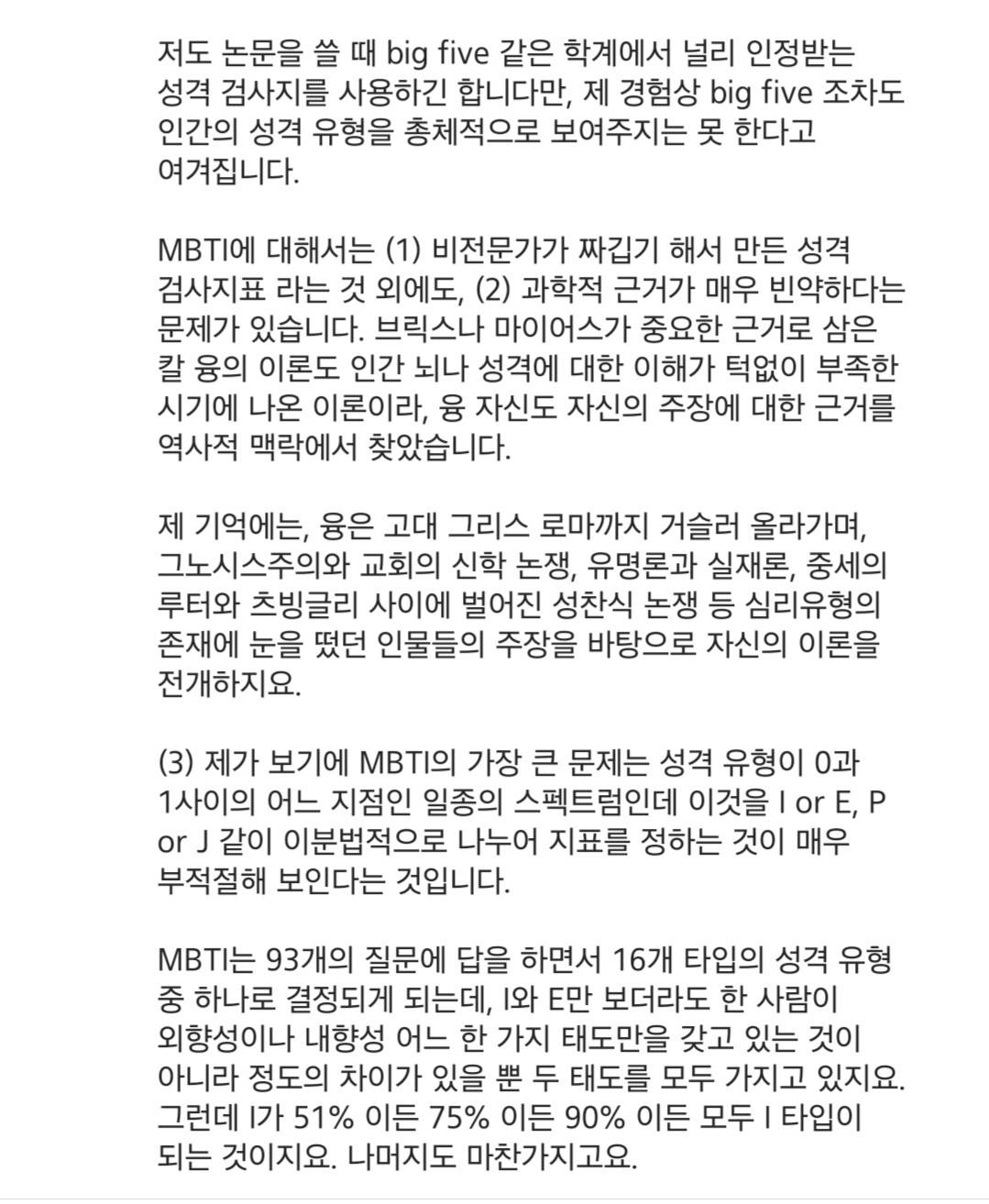 작성자베르3나르1 작성시간 20.10.05 성격학 관련책 좀만 봐도 엠비티아이 존나 깐다고ㅜ 특히 (3)때문에 많이 까더라