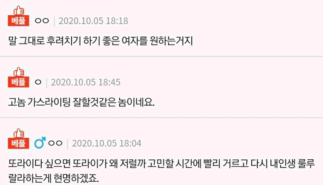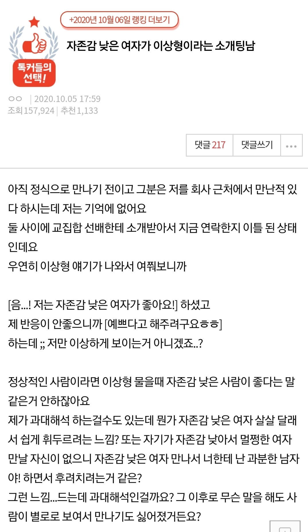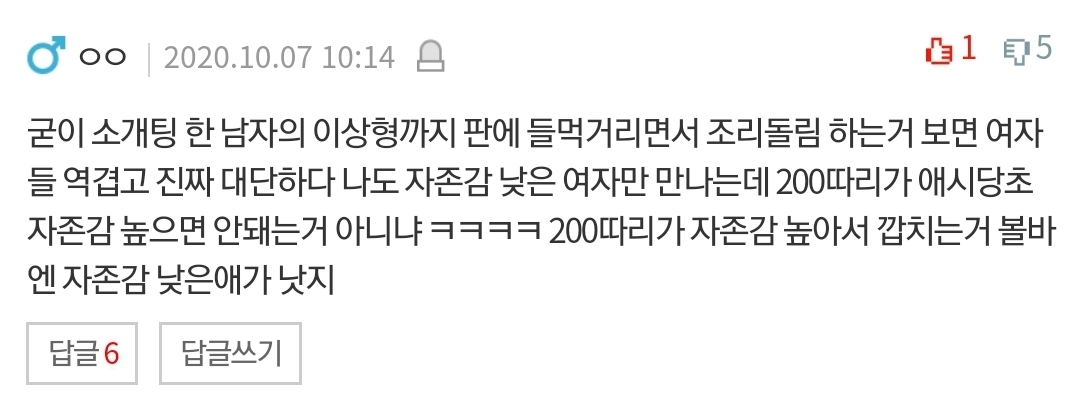 [기타](네이트판) 자존감 낮은 여자가 이상형이라는 소개팅남 작성자그린티라떼샷추가|작성시간20.10.07|조회수6,195 목록 댓글 26 글자크기 작게가 글자크기 크게가 출처 : https://m.pann.nate.com/talk/354658986자존감 높은 여자는 무섭냐; 좃찐따새끼 ㅗ 다음검색 현재 게시글 추가 기능 열기 북마크 공유하기 신고 센터로 신고 댓글 댓글 26 댓글쓰기 답글쓰기 댓글 리스트 작성자느개비가내려와~~ | 작성시간 20.10.07 깝치는?지가 상사노 작성자로마노프 | 작성시간 20.10.07 말로 뱉어줘서 고맙네ㅋㅋ 작성자뭐야 다돌려놔 | 작성시간 20.10.07 ㅋㅋㅋㅋ 가스충이노 작성자오몰입과타쿠 | 작성시간 20.10.07 200따리가 뭐야?? ㅜㅠㅠ 200충 이런건가? 작성자이 바람을 이겨내면 난 꽃 피겠지요 | 작성시간 20.10.07 헐 나 어릴때 자존감 좀 낮앗을때도 눈은 높앗음;; 등신 댓글 전체보기