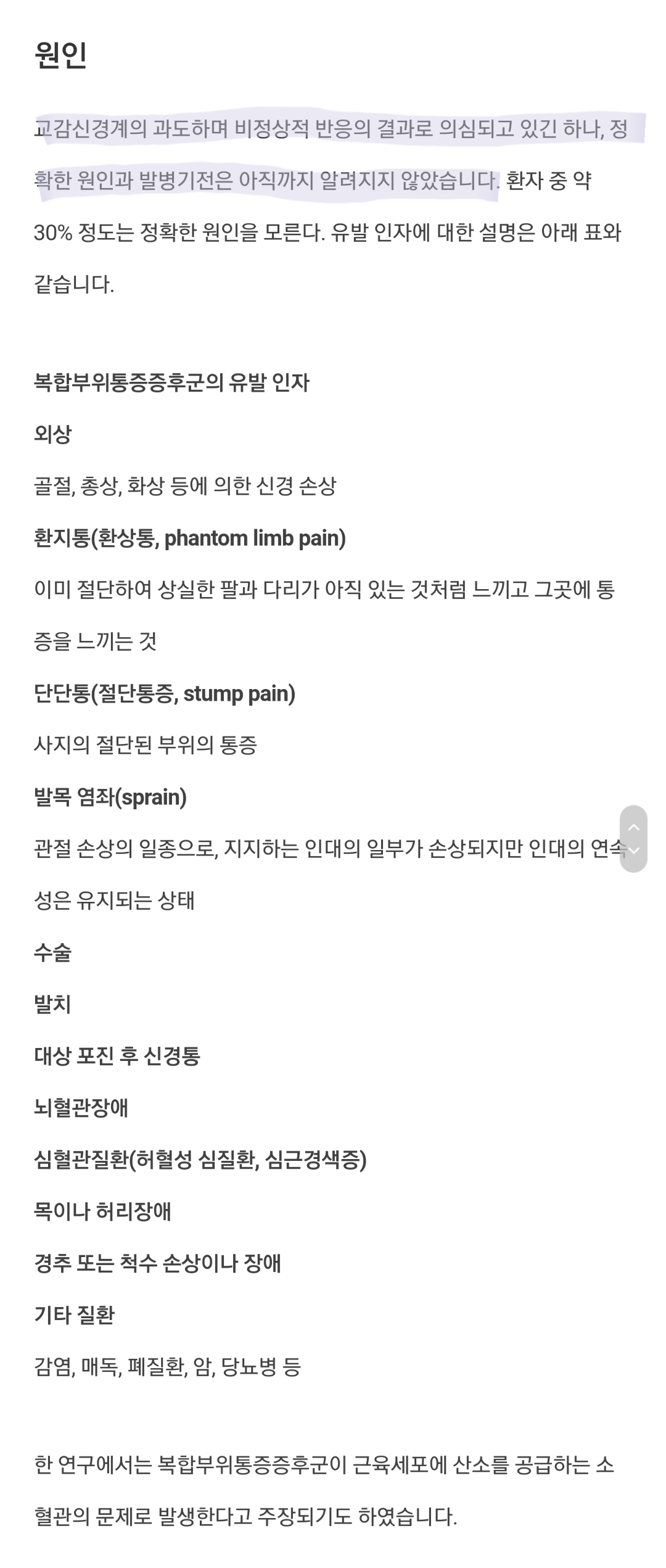 바늘에 찔리는 정도의 아주 가벼운 외상에서부터 교통사고, 화상, 기타 질병 등이 원인이 되는데 쉽게 말해 어떤 자극이든 crps 발병의 트리거가 될 수 있다는 얘기야.