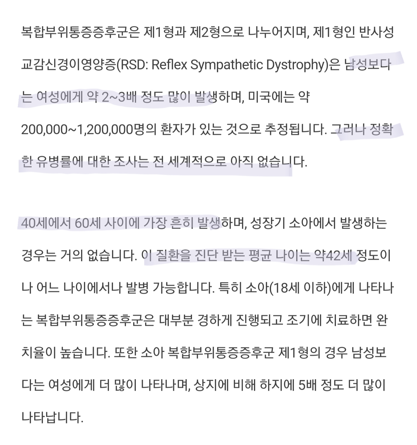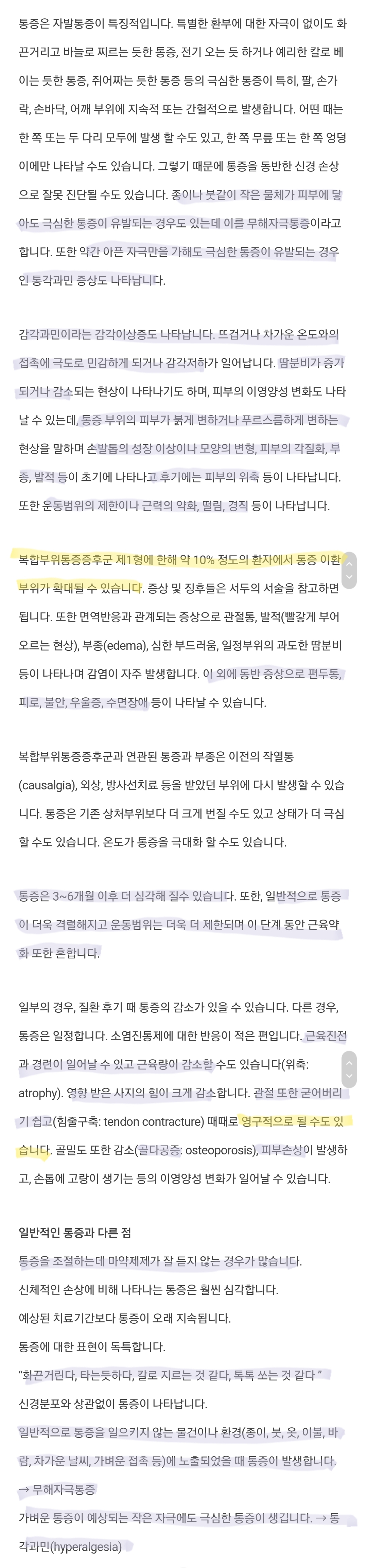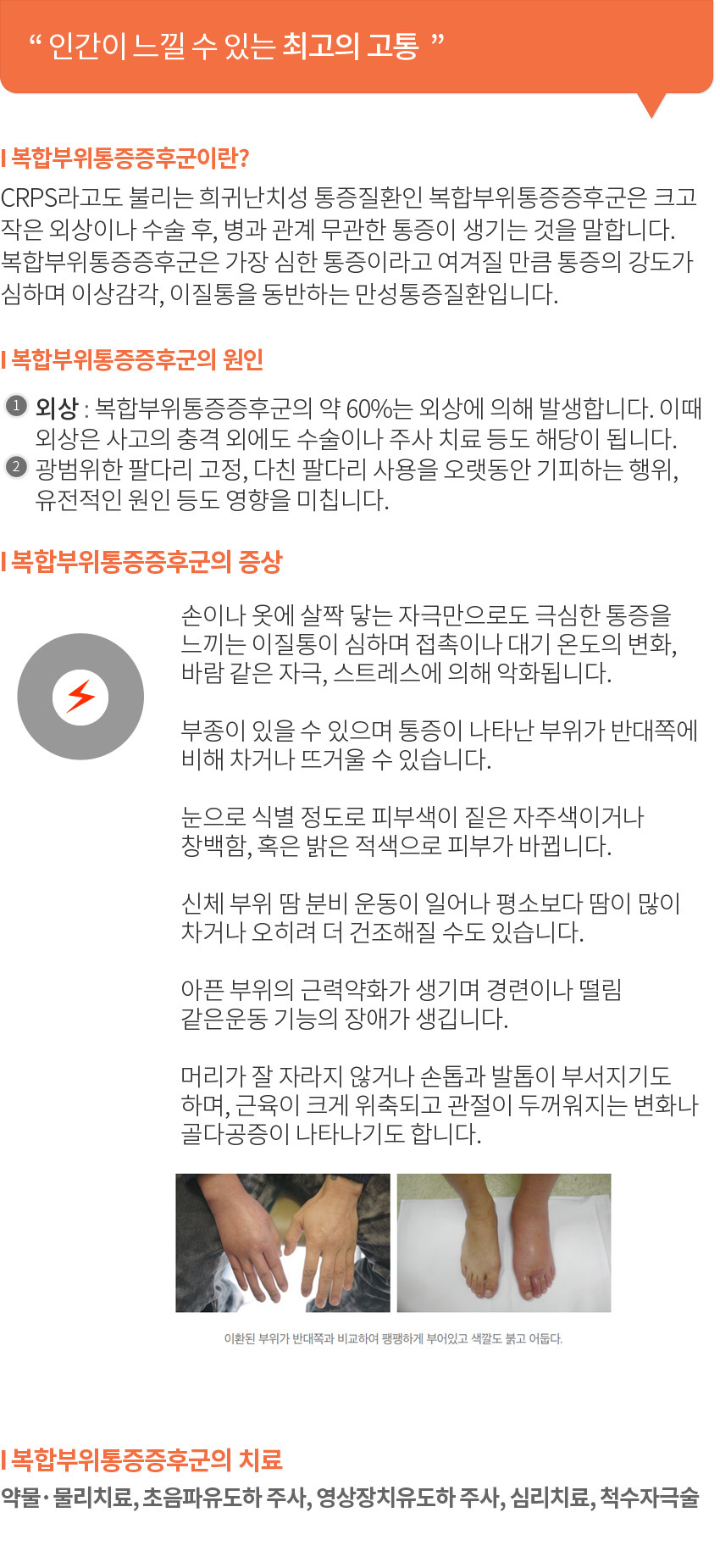 🍀crps 환자의 공통 증상은 출산에서 신체절단 정도의 통증을 느낀다는 점인데, 아이러니하게도 국내에도 수만 명의 환자들이 있지만 그 환자들 모두가 발병 이유가 달라. 정확히 어떤 이유에서 발병했다고 밝힐 수도 없고 그저 유추만 가능할 뿐이야.