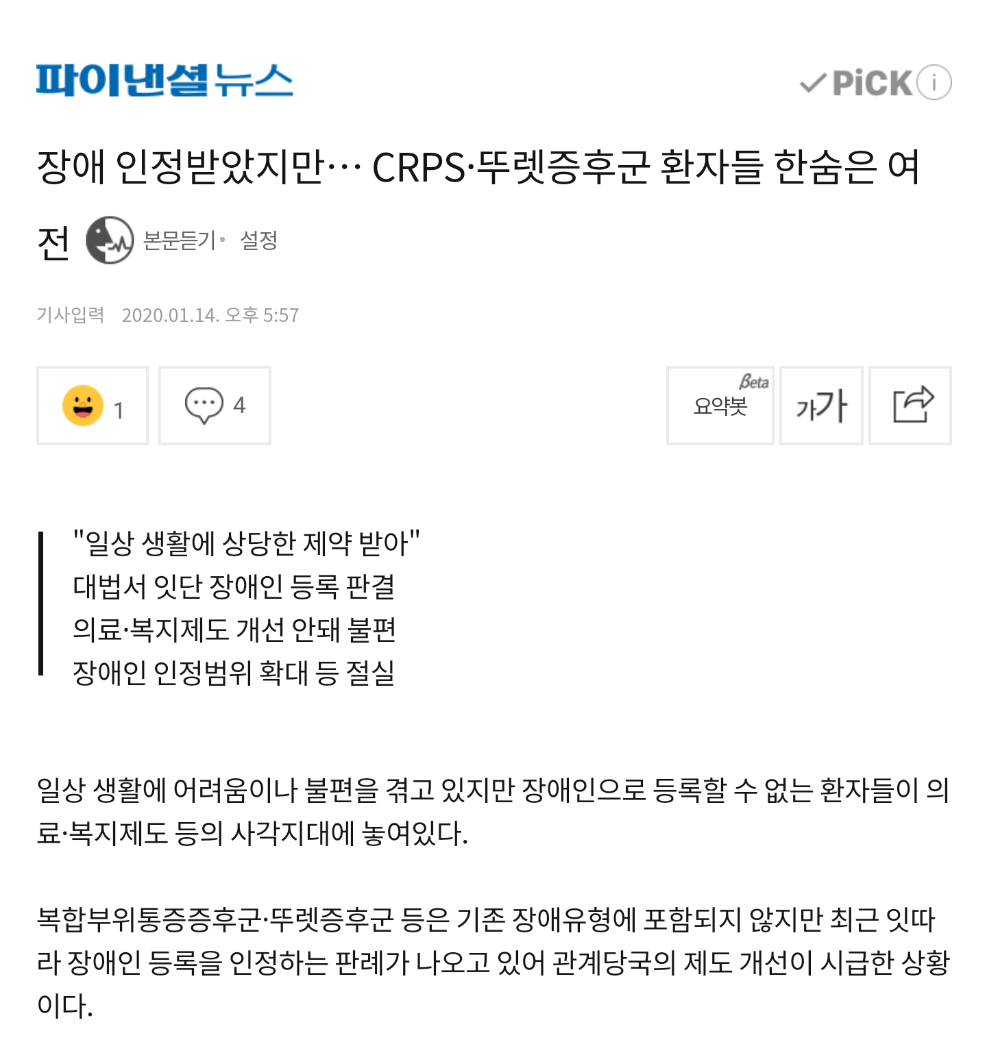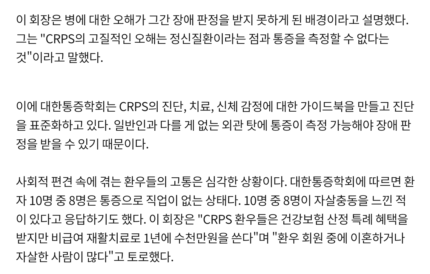 🍀한국의 장애인복지법에서는 통증에 의한 지체장애는 장애로 인정하지 않았는데, 최근에는 crps가 장애 인정을 받았어. 하지만 역시 까다로운 가이드라인을 충족하는 아주 극소수의 환자만 인정해줘서 대부분의 환자들은 산정특례 등재도 장애 인정도 받지 못해 사각지대 안에서 생활고와 의료비 문제로 고통에 시달리고 있어.