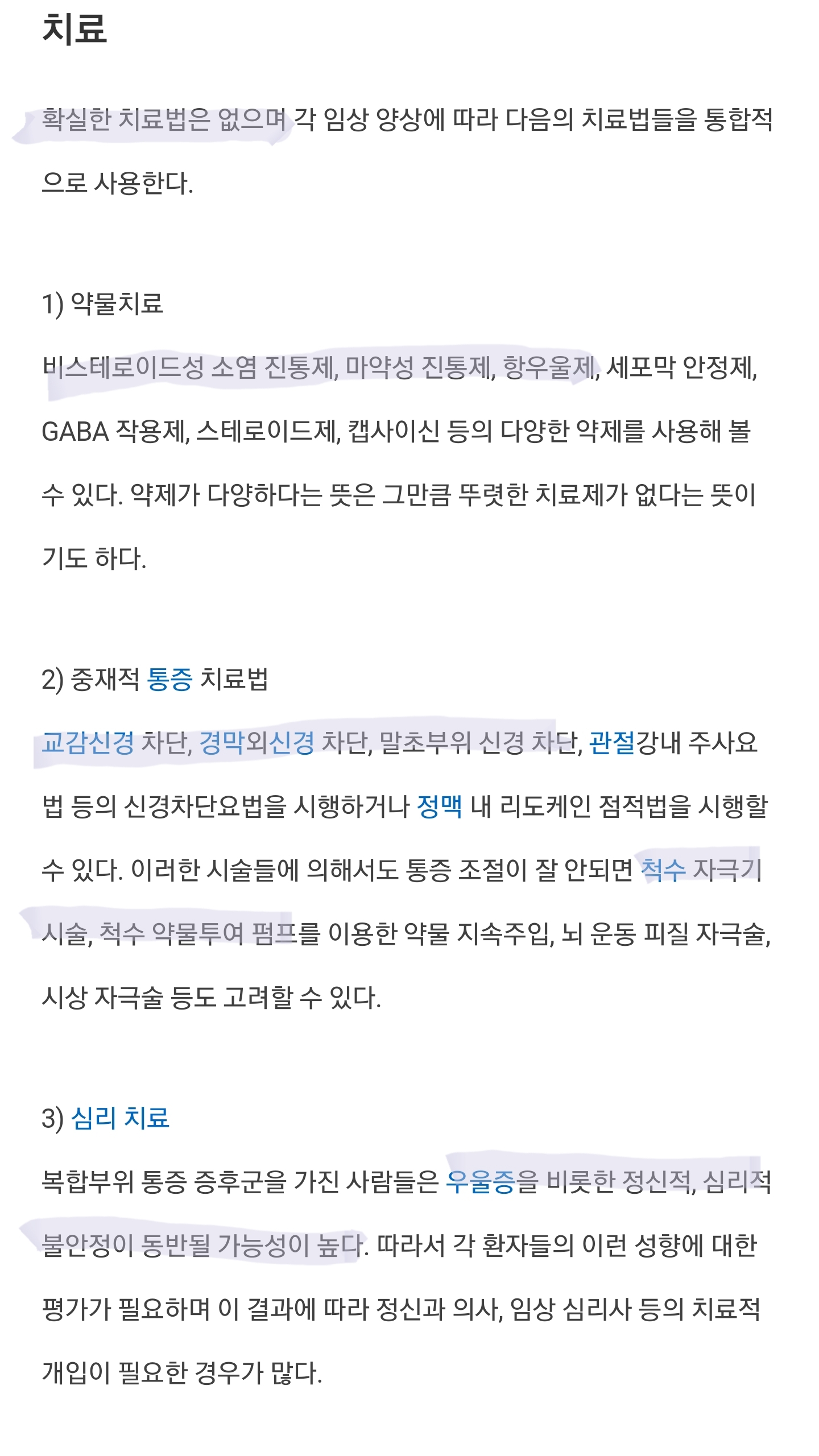 🍀이 외에도 몇 가지 시술이 더 있지만 기본적으로 CRPS 환자들이 치료하는 방법이야. 환부나 통증 양상에 따라서 시행하는 시술이 달라. 하지만 이런 시술들도 완치의 목적이 아닌 단순히 통증 경감을 위한 방법일 뿐 아직까지 완치할 수 있는 치료법은 없어. 시술로 통증이 덜어지면 다행이지만 그마저도 경미한 수준에 그치는 게 대부분이야.