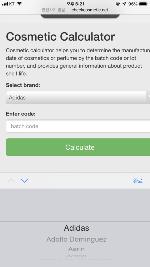 5. 다섯번째는 향수 보틀 밑에 보시면 로트번호 즉 일련번호같은게 적혀있습니다. 확인할수 있는 사이트는 cosmetic calculator라는 사이트입니다.
