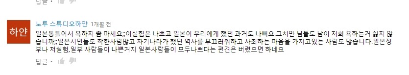 일본 통틀어서 욕하지 좀 마세요;; 이실험은 나쁘고 일본이 우리에게 했던 과거도 나뻐요 그치만 님들도 남이 저희 욕하는거 싫지 않습니까 일본 시민들도 착한사람 많고 역사 부끄러워하고 사죄하는 마음 갖고 있는 사람도 많아요 저실험, 일부 사람들이 나쁜거