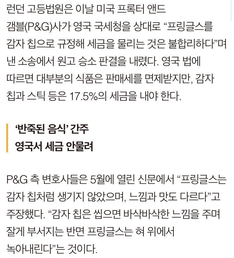 [여시뉴스데스크]“프링글스는 감자칩 아니다” 작성자평온한마음갖기운동|작성시간20.10.11|조회수31,570 목록 댓글 12 글자크기 작게가 글자크기 크게가 출처 https://news.joins.com/article/3215577눈뜨자마자 먹다가 찾아봄나만몰랐던거였어도 먹던거 계속먹음.. 다음검색 현재 게시글 추가 기능 열기 북마크 공유하기 신고 센터로 신고 댓글 댓글 12 댓글쓰기 답글쓰기 댓글 리스트 작성자일본침몰 소취 | 작성시간 20.10.11 역시 장사치는 다르다 작성자NTG 효정 | 작성시간 20.10.11 어쩐지.. 내가 프링글스를 안먹는 이유가 이거였네 작성자해낼것이다 매우그랬듯 | 작성시간 20.10.11 먹어보면 감자칩맛이 아님ㅜㅜㅜ 작성자안녕, 오늘의 그대에게 | 작성시간 20.10.11 ? 작성자엿먹어랏 | 작성시간 20.10.11 반죽된음식같은 유사감자칩을 더 규제해야되는거아님?; 댓글 전체보기
