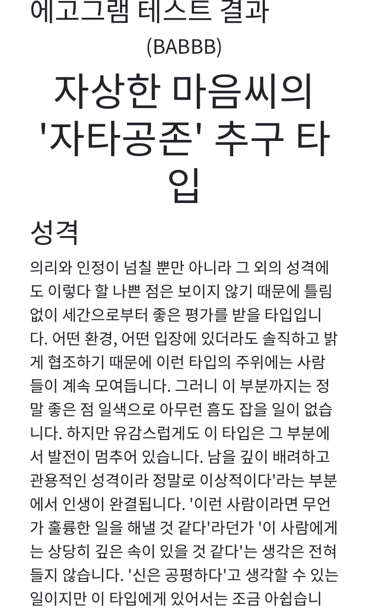 [흥미돋]팩폭 오지는 현실적인 성격테스트 "에고그램" 작성자옥돌매트|작성시간20.10.12|조회수32,464 목록 댓글 586 글자크기 작게가 글자크기 크게가 출처 : https://egogramtest.kr/ 좋은 말 술술 나오다가 급 팩폭...테스트 주소는 위 출처 부분에 있어!+ 내 mbti는 ENFJ인데 mbti 설명이랑 비슷한 부분 있어서 놀람! 다음검색 현재 게시글 추가 기능 열기 북마크 공유하기 신고 센터로 신고 댓글 댓글 586 댓글쓰기 답글쓰기 댓글 리스트 작성자ㅏ리아나 | 작성시간 20.11.10 괜찮은데 왜 이게 나오는거 istp 이미지 확대 작성자오프온오프 | 작성시간 20.11.10 오 Enfp인데 이거나옴 이미지 확대 작성자간생간죽 | 작성시간 21.03.04 존나 줘패네..... 이미지 확대 작성자블초블초 | 작성시간 23.03.02 너무해요 욕뿐이장아요 이미지 확대 작성자내눈써어업 | 작성시간 24.09.26 INTJ 이미지 확대 댓글 전체보기