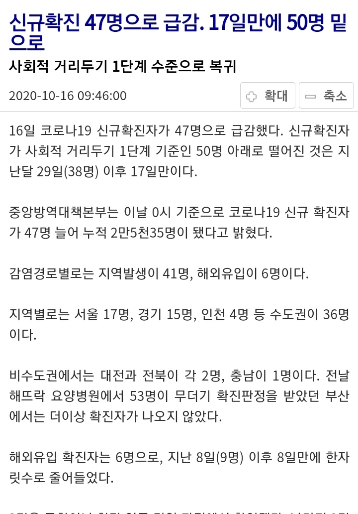 작성자내존재화이팅 작성시간 20.10.16 와 다행이다 이대로 쭉 줄어들길 ㅜㅜ 다들 좀더 힘내서 방역수칙 지킵시다
