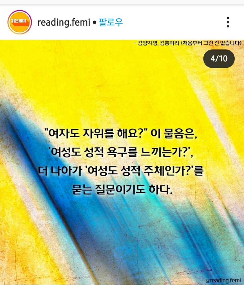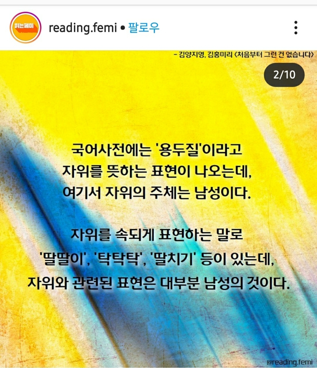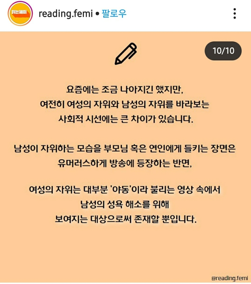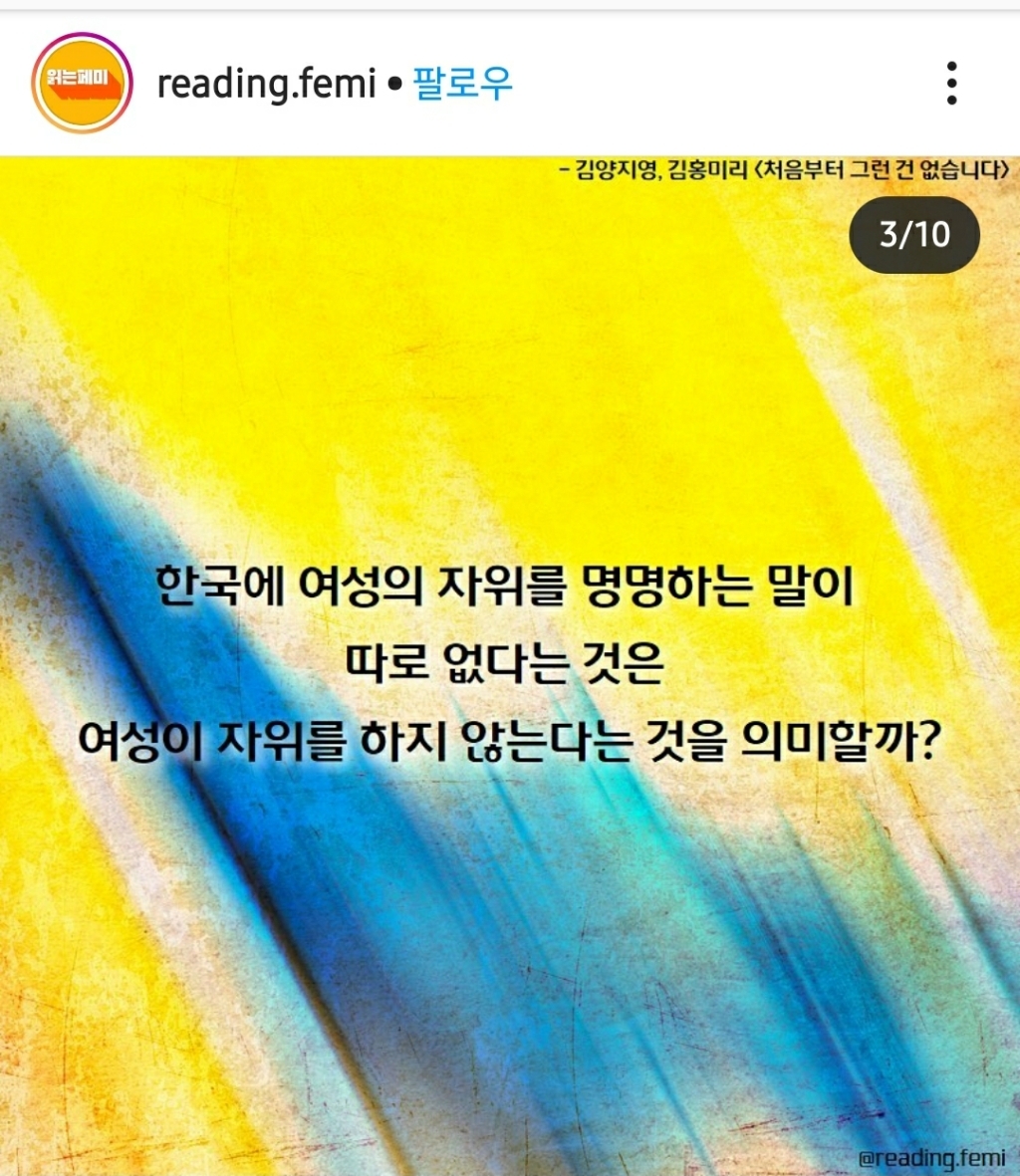 [기타]여성의 자위를 뜻하는 단어는? 작성자헤이gril유교gril|작성시간20.10.17|조회수11,151 목록 댓글 22 글자크기 작게가 글자크기 크게가 출처 : 읽는페미 인스타그램https://www.instagram.com/p/CGXNY4el0kq/?igshid=6b2nwpk551up 다음검색 현재 게시글 추가 기능 열기 북마크 공유하기 신고 센터로 신고 댓글 댓글 22 댓글쓰기 답글쓰기 댓글 리스트 작성자까망이노랑이 | 작성시간 20.10.17 레로 소나 오래가자~~ 작성자할수있는것부터 하자 | 작성시간 20.10.17 생각난 김에 아들치고와야지 작성자어제보다나은오늘 | 작성시간 20.10.18 아들치기~~ 작성자고마버 | 작성시간 20.10.18 아들치기아녀..? 작성자여드름조팔 | 작성시간 20.10.19 생각난김에 아들치고 와야지 댓글 전체보기