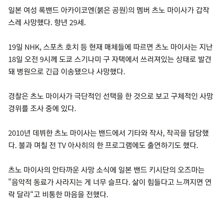 [스크랩] [여시뉴스데스크]日 록밴드 아카이코엔 멤버 츠노 마이사, 29세로 사망 작성자살인|작성시간20.10.20|조회수8,354 목록 댓글 12 글자크기 작게가 글자크기 크게가 ...일본에서는 올해에만 5명의 연예인들이 극단적 선택으로세상을 떠남.. 다음검색 스크랩 원문 : 이종격투기 현재 게시글 추가 기능 열기 북마크 공유하기 신고 센터로 신고 댓글 댓글 12 댓글쓰기 답글쓰기 댓글 리스트 작성자아 테스형~! | 작성시간 20.10.20 왜이려 ㅠㅜ... 작성자넌너넌너너 | 작성시간 20.10.20 일본 왜그래?.... 어휴...삼가 고인의 명복을 빕니다 작성자메를릔 | 작성시간 20.10.20 일본 왜그래.. 작성자단호박호박단 | 작성시간 20.10.20 쟤네 한국 연예인 죽으면 신나서 한국 연예계 문제 있다고 특집 방송내더니... 한 해에 다섯명이면 대체 무슨 일이 일어나고 있는 거임 작성자清原翔 | 작성시간 20.10.21 헐 오바야.. 진짜 좋아하는 밴드인데.. 댓글 전체보기