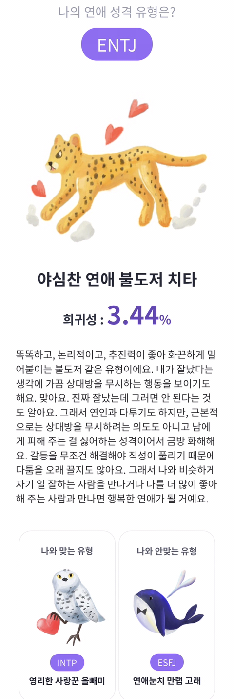 [흥미돋]동물로 알아보는 연애유형 테스트 작성자reptilian|작성시간20.10.28|조회수12,964 목록 댓글 55 글자크기 작게가 글자크기 크게가 출처 : 여성시대 reptilianhttps://mbti.amanda.co.kr/여기서 해보면 돼나는 intp인데 entj 나옴 ㅋㅋ~~~이거 좀 신기한게 나와 맞는 유형에 내 원래 mbti 비슷하게 나오는듯 다음검색 현재 게시글 추가 기능 열기 북마크 공유하기 신고 센터로 신고 댓글 댓글 55 댓글쓰기 답글쓰기 댓글 리스트 작성자칼국수처돌이 | 작성시간 20.10.29 인프피인데 ㅋㅋㅋㅋ머노 ㅋㅋㅋ 이미지 확대 작성자study.hard | 작성시간 20.11.01 Isfj istj 왔다갔다 하는데 이거 나옴,,, 이미지 확대 답댓글 작성자study.hard | 작성시간 20.11.01 심지어 안 맞는 유형이 isfj네ㅋㅋㅋㅋㅋㅋ 이미지 확대 작성자하루의 끝(End of a day) | 작성시간 20.11.22 잇프피인데 인프피나오고 안맞는유형 잇프피나왔엌ㅋㅋㅋㅋ 이미지 확대 작성자serenityy | 작성시간 20.11.22 INFP인데 ESTJ나옴 ㅋㅋㅋ 댓글 전체보기