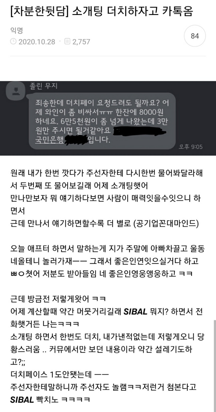 [배꼽의행방]소개팅 덮집회의 결말.jpg 작성자볼빨간 갱년기|작성시간20.10.29|조회수11,132 목록 댓글 33 글자크기 작게가 글자크기 크게가 출처 : http://m.cafe.daum.net/subdued20club/RsQV/5056854?svc=cafeapp- 허락댓글 + 결말ㅋㅋㅋㅋ 친구도 잃고 돈도 잃고 전부 잃음ㅋㅋㅋ 다음검색 현재 게시글 추가 기능 열기 북마크 공유하기 신고 센터로 신고 댓글 댓글 33 댓글쓰기 답글쓰기 댓글 리스트 작성자GoodThings | 작성시간 20.10.29 싫다는사람 끌어내놓고 무슨짓? 작성자왜자꾸배고프니 | 작성시간 20.10.30 윽.. 그자리를 만들었으면 대접을해야지 작성자허니버럴 | 작성시간 20.10.30 아니 그냥 친구만 불러내도 본인이 내야되는거 아니냐ㅠㅠㅠ 작성자Je te veux | 작성시간 20.10.30 진짜 등신같다 ㅋㅋㅋㅋ 작성자영양제구입 | 작성시간 20.10.30 애프터하면서 '아빠차'끌고올테니깤ㅋㅋㅋㅋㅋ 지차도 아니고 아빠챀ㅋㅋㅋ 댓글 전체보기